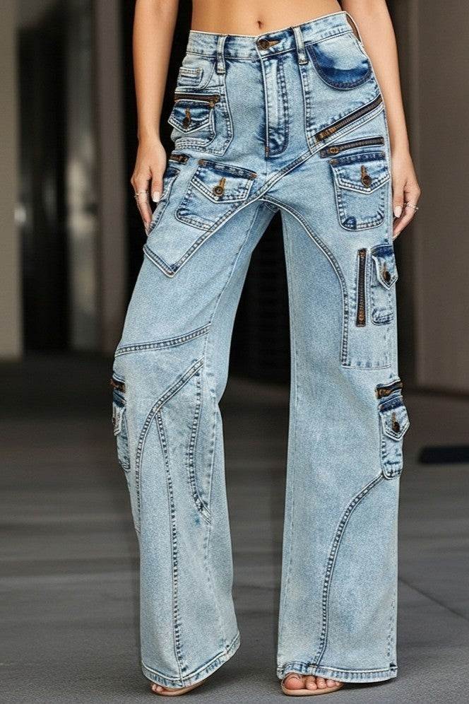 High Rise Multi-Pocket Cargo Denim Jeans